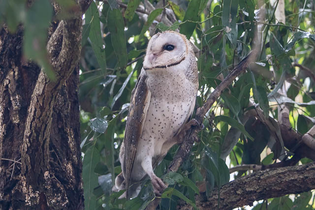 I then spotted a Barn Owl in the tree. All the other birds were trying to drive it away and they succeeded. It soon flew away accompanied by the posse.