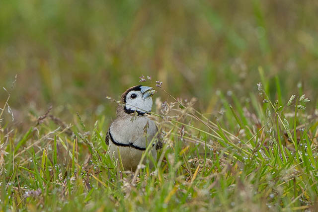 I spotted two Double-barred Finches on the grass. I sat down low and waited for them to get closer.