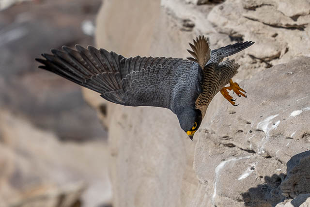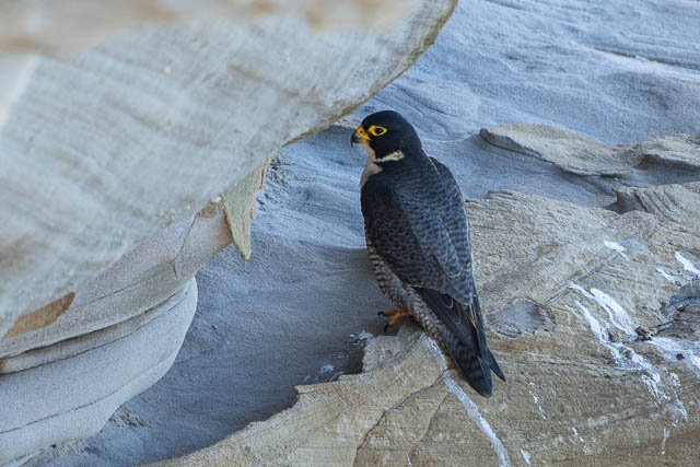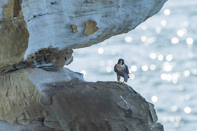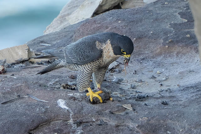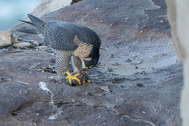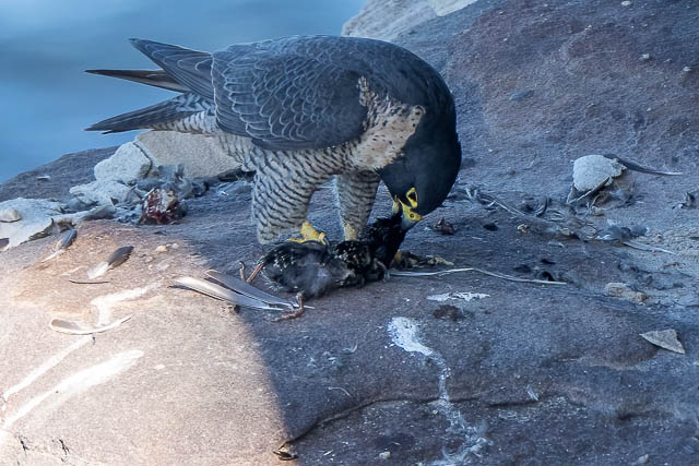 The female flew out of sight too. It was not till about 45 minutes later that we saw them again. We first heard them, further along the cliffs, then we spotted both birds. One was on a lower ledge, and it had some prey.