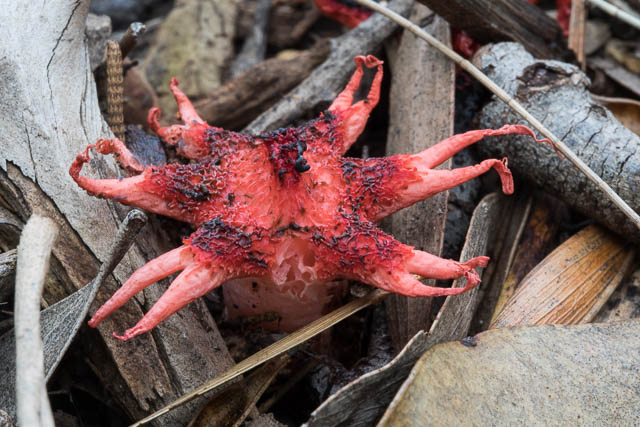 Riding back home, I decided to go along to Cooks River to check out the wetlands. I had heard from the Cooks River Facebook Page that some stinkhorn fungi had been observed along the river somewhere. Early on my ride, I found a lot of them in the re-established bushland near Ewan Park. But they were all well past their prime. They were Phallus rubicundus. I am hoping that they will appear again the next time it rains.
