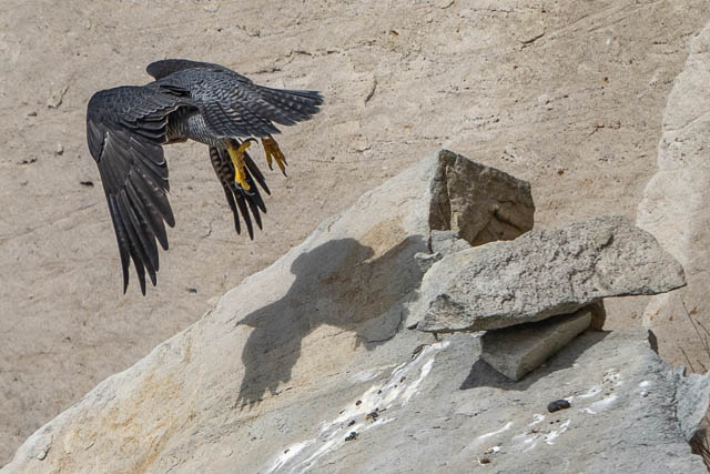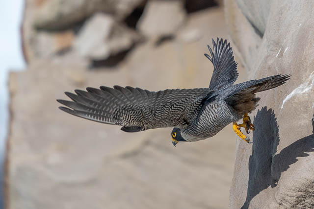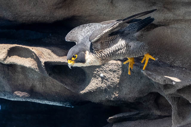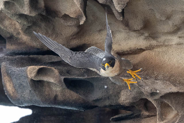 This was a nice take-off sequence. Then a switcheroo took place. The male flew out of sight under an overhang, and at the same time the female flew out.