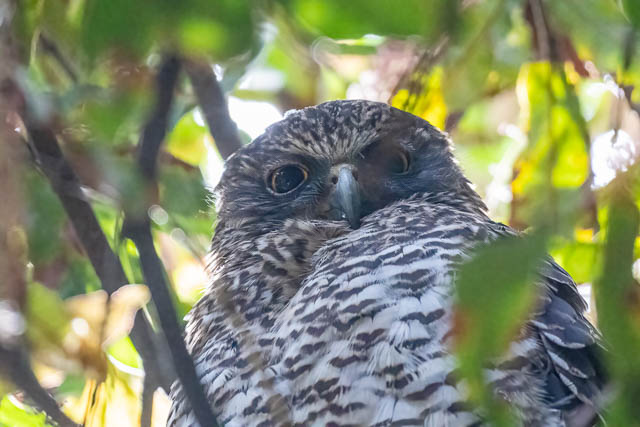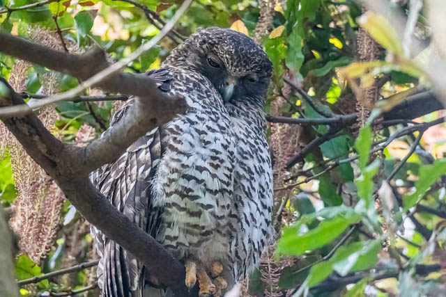 The last photos were taken in the Royal Botanic Garden, and I then looked around for the resident Powerful Owl. I first looked in the usual spot – a Macadamia tree, but could not see it, so looked in some other trees thatI and seen it roost in on previous visits. I had no luck, so I visited the information desk near the shop, The lady there, said she had seen the owl that morning, and it was in the Macadamia tree. So I went back for a better look and eventually spotted it.