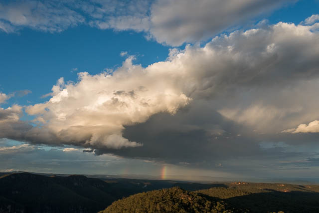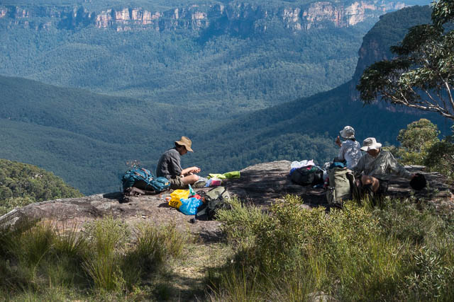 Next was some ridge walking, heading to Mt Hay. Part way, we stopped at a very nice campsite right on top of the Boorong Crags. We could obtain good water from the many rockpools on the platforms around about. We also had great views in all directions. We could look east and see the distant buildings of Sydney. To the north was the Grose Valley – very impressive in its deep gorge. Overhead a storm was passing by. It seemed to miss us.