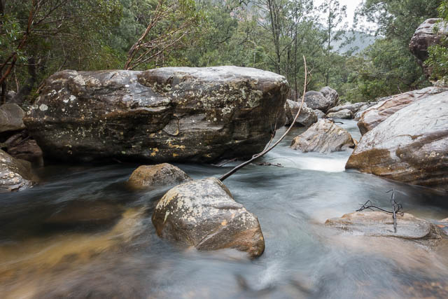 Further downstream, the going was a lot harder and slower. In a few places we could find short sections of the Engineers Track, but it was largely either completely overgrown or had been washed away. The riverbed was quite slow – with large boulders that were very slippery due to the rain. So our walking was a mixture of the riverbed or along the steep scrubby sides.