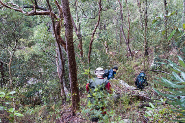 Then it was easy going, climbing up Shaw Gully. The creek was flowing a lot so we couldn’t walk up the creekbed, but it was easy to climb next to it (on the western side). Then is was more easy going up a short steep section at the cliffline – the section known as Byles Pass, after being pioneered by early bushwalkers Marie Byles and Margery Shaw. An alternative name for this creek/pass that was used by the Kameruka Bushwalkers back in the 1960’s was “Y Creek”. This is due to the shape of the creek on the map. We climbed right up the creek to the Y and then up the ridge between the two branches. It was easy going all the way – and not too scrubby.