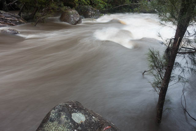 Overnight it start raining again. And there was a lot of rain. It kept on raining, continuously, right through to the morning. When we awoke, we found the river very high and some of our gear wet. The rain seemed to show no sign of slowing – so we decided it was wise to abandon our original goal. We could escape from the gorge via the nearby Shaws Gully if we needed to. So we stayed put.