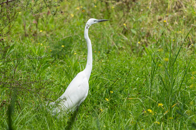 A Great Egret was hunting in the bush near the hide –