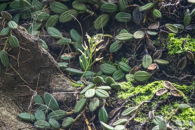 At the old swimming pool, I looked up at the rock orchids (Dendrobium linguiforme)above. It looked like some had been in flower.