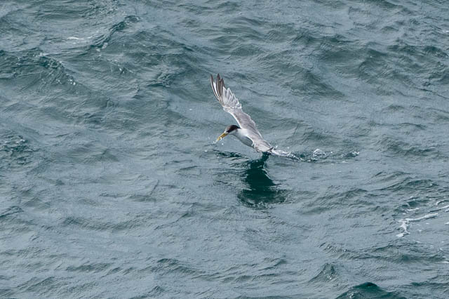 The Peregrine Falcon seemed pretty settled. So we looked for whales. We saw quite a few passing Crested Terns. This one has a small fish.