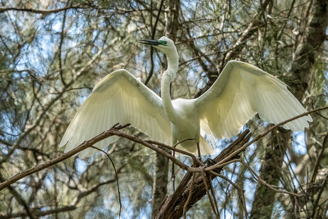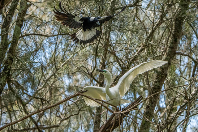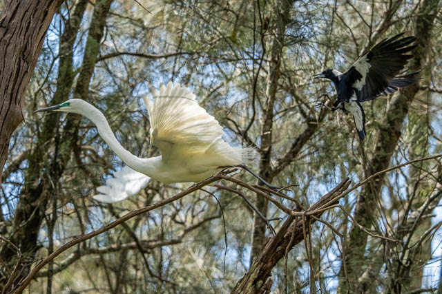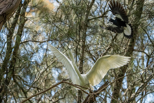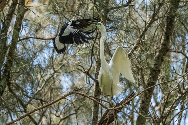A Little Pied Cormorant looked on as the Egret landed nearby.