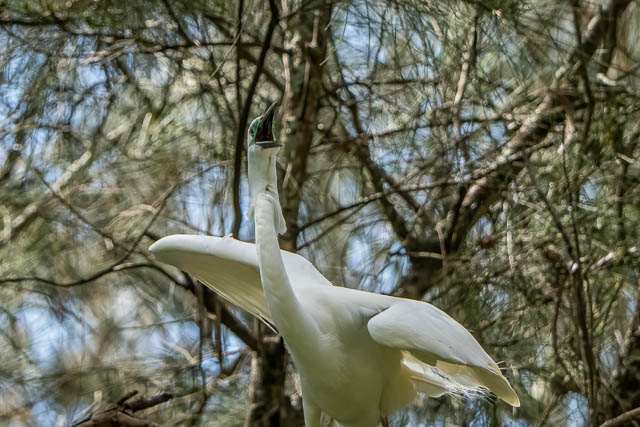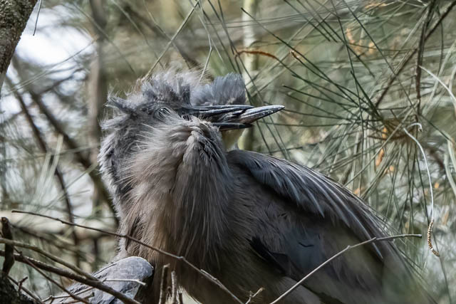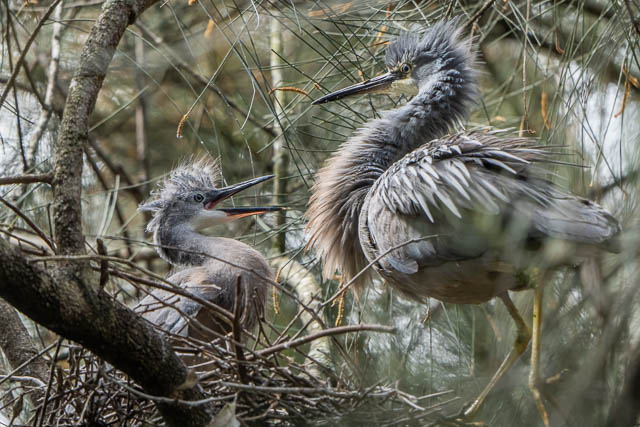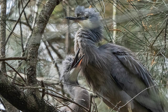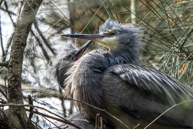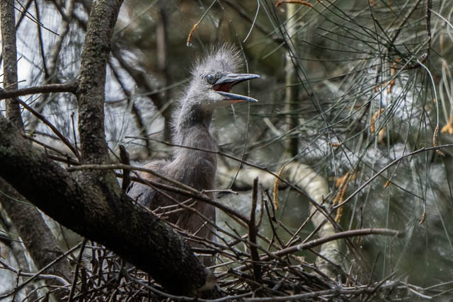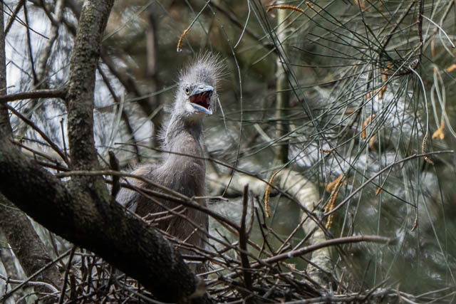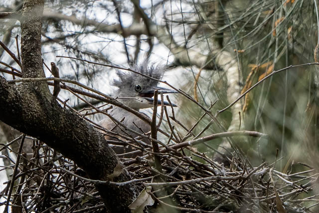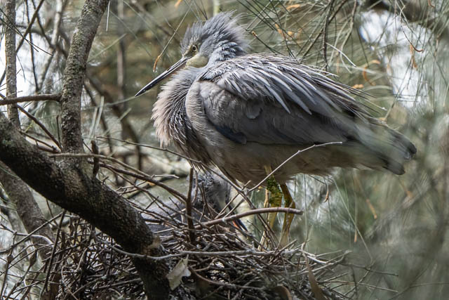 I had been watching a White-faced Heron nest above the Kingfisher pool. I had seen a chick looking out, waiting fora parent to return with food. This time it did. The chick was looking quite excited.