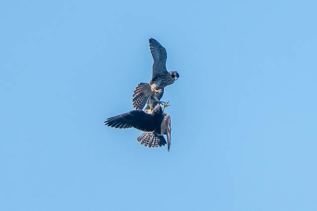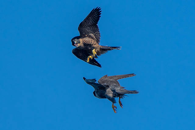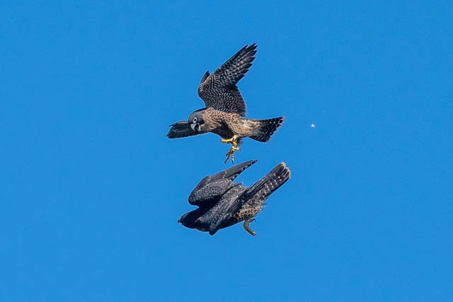 The juvenile and its parent have their talons locked.