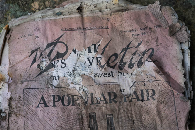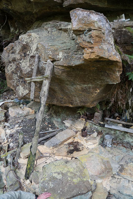 As caves go – it was not too impressive. Only big enough for a few people to sleep in and not too sheltered. It would be hard to find firewood on the small ledge it was on. But a lot of work had been done in the cave. A fireplace had been constructed and rocks concreted together to make platforms. There were several shelves and a lot of junk. Rubbish or relics? Some of the stuff in the cave was certainly old – pots and pans, an old jaffle iron, cups, bottles, lanterns etc. An earlier visitor had placed a pile of newspapers and magazines into a plastic bag, not a good idea, as they were now going mouldy. We found one magazine that dated back to 1928. An old ladder led up to a higher level where food was stored. This ladder has now been badly burnt by a bushfire and can no longer be used.