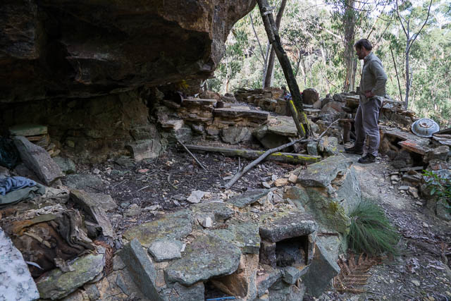 Frank Walford had set up his cave much earlier – in the 1920’s. It seems to be not that well known by bushwalkers. Andy Macqueen mentions the cave in his book on the history of the Grose Valley – “Back From the Brink”. He limits his description to saying the cave is located near Mt Carne and overlooks the creek above Arethusa Canyon. It seemed to both Bob and myself that it would be a challenge to try and locate the cave.