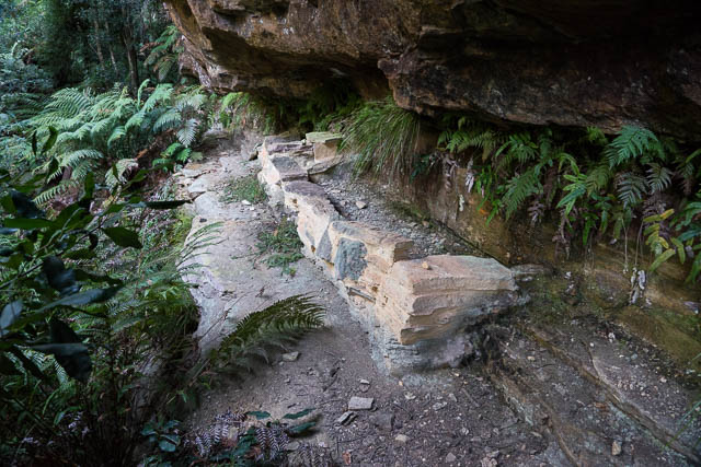 After lunch, we headed into Blackheath and out along Evans Lookout Road. Both of us had visited Walls Cave many years before (in the late 1970’s?) – it was time for another look. The track to the cave is certainly different. A set of well constructed steps lead down to a small canyon and tunnel and then you follow blocks down the creekbed to arrive at the cave. In the cave itself is a platform and visitors are asked to not venture past it as the cave has a lot of significant as an aboriginal site.