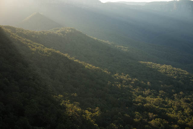 At dawn, I got out of my tarp, and went to Melvilles Lookout to see what conditions were like. This time there was a fair amount of morning mist that had settled in the Burragorang Valley. Would it be in the Jamison Valley as well? I quickly walked down the gully to the northern lookout and arrived just before the sun rose. There was also a fair amount of mist in the Jamison Valley. Nice. It was a cool morning and it was pleasant to be in the Sun’s rays while I photographed. Then back to the south side to Melvilles Lookout for a few more photos.