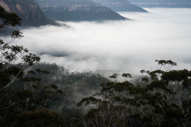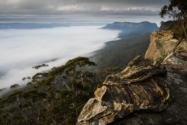 In the evening, Digi Dave and myself camped at Katoomba and we both got up early for a dawn photo shoot on Narrow Neck. Mist had formed in the Jamison Valley but overcast conditions did not make for good lighting.