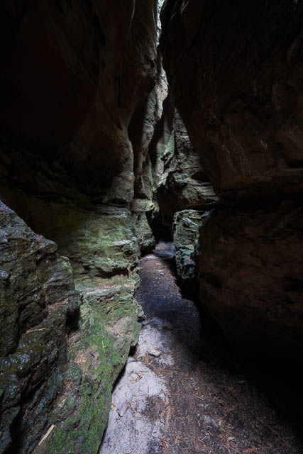 After setting up tents, many in the party set of down to the canyon. This is an easy 15 minute walk along a track through open forest. Gradually the pagodas on either dies of the valley draw closer together and then the valley drops suddenly and surprisingly into a nice canyon. The Dry Canyon is usually completely dry – you don’t even get your feet wet! It is also quite spectacular – with two sections of constriction – a short upper one and a longer, darker one a short distance downstream.