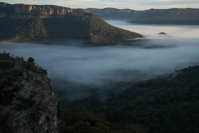 Next morning, Wendy and myself got up early and walked back down to the canyon and climbed out to the lookout for some dawn photography. Still conditions had helped some valley mist form in the Wolgan Valley. This covered up the open valley and in particular the rather untidy Wolgan Resort with its buidlings, carparks and sewerage ponds. Good conditions fora few photos.