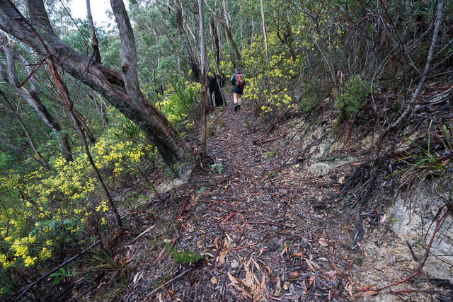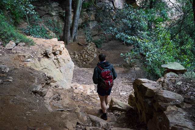 We continued under the cliff, and above the talus slope to soon arrive at the Colleseum. This is a huge overhang. In the cave is some very old looking dry stonewalling and an old rock table. The track, now called Murphys Track continues past the cave, descending on old stone steps near the creek, then crosses the creek and follows a benched path around the forest and heads towards the open farmlands of Megalong. We followed the track and took a branch that led back to the base of Sentinel Pass.