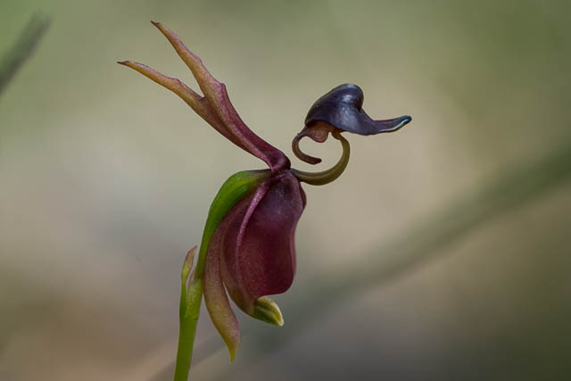 We could not help noticing a few groups of Waratahs, but hiding beneath them, Wendy spotted some flying duck orchids. These are very interesting. On the way back, while taking some photographs of them, we noticed that the “head” of one of them suddenly snapped down into the “body”. This is a mechanism, like that of the trigger plant that has evolved to aid the orchid’s fertilisation. The orchid has a structure that mimics a female sawfly, this attracts a male sawfly, which attempts to mate. The “ducks head” then snaps down trapping the sawfly for a while. The mechanism seems to reset in an hour or so.