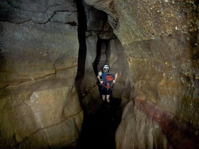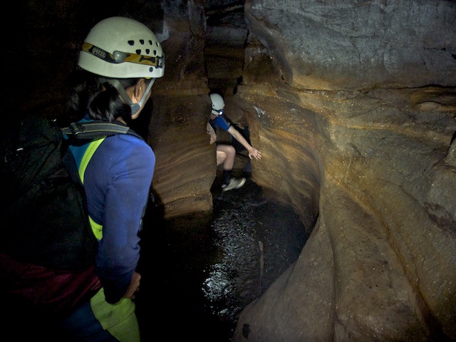 As well as glow worms, the tunnel is also the home to bats. For that reason it is best to avoid visiting the canyon during winter when the bats breed. The tunnel can also fill up with water and require swimming. Some other times it is completely dry. On our visit there were some deep wades (chest deep?). Being with rock climbers, it was not too hard to avoid and deep wades by bridging. The canyon is narrow enough to do this and it adds to the entertainment.