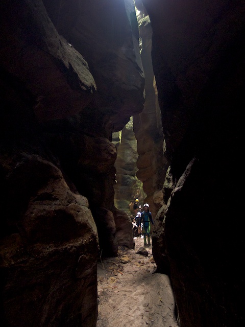 Newnes canyon only has one tunnel section but it is long enough to require the use of a torch or headlamp to get through it. The tunnel can be reached from below with having to reverse any abseils, so it is possible aboriginals would have visited the tunnel. But is is doubtful they could have gone far up it in total darkness.