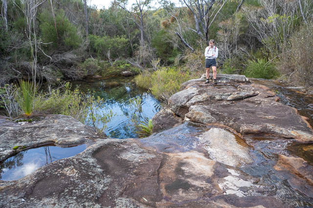 Further along, we turned off the fire road and followed the old track to the Blue Pools in Uloola Creek. This track, still marked on the topographic map, was very overgrown but still followable. It also took us to our next Aboriginal site. This was a large engraving of a figure that was pointing with an outstretched arm.