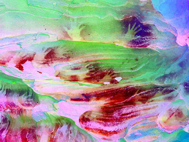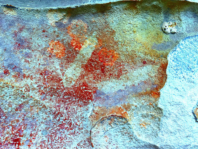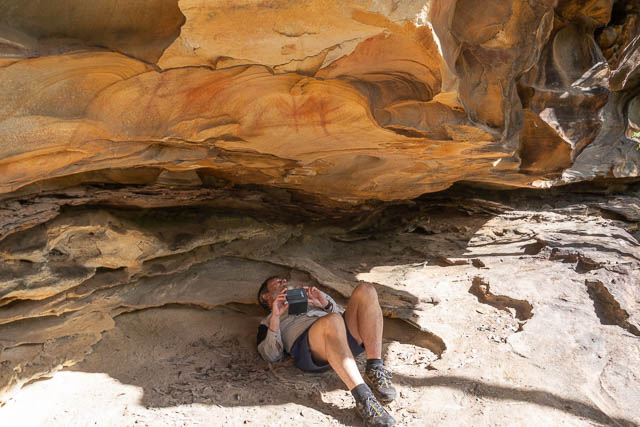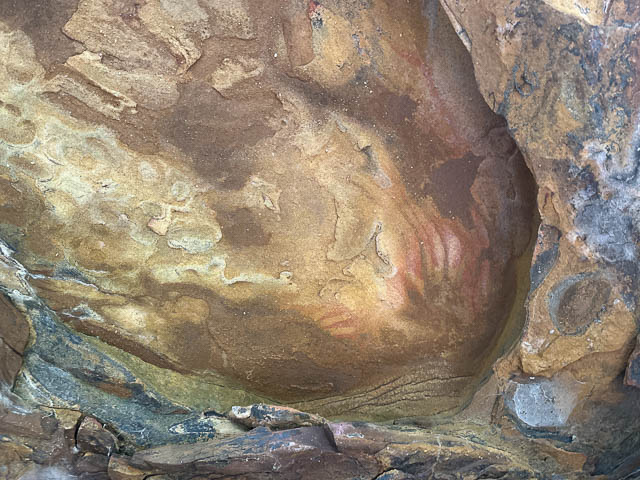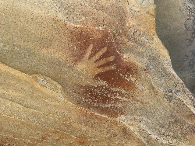 This was a small cave, and we found two red ochre hand stencils on the roof –