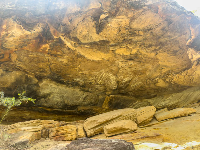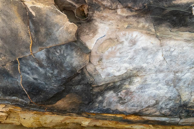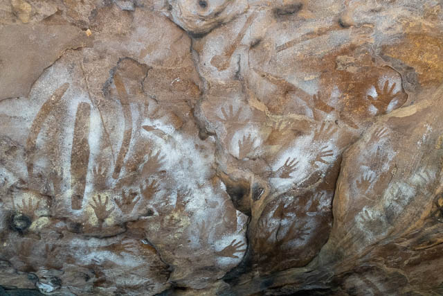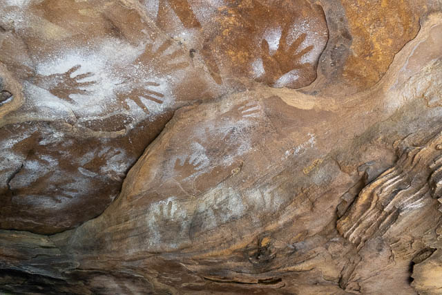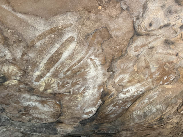 There are plenty of hand stencils, stencils of boomerangs, bull roarers, clap sticks and stone axes. Very impressive.