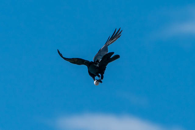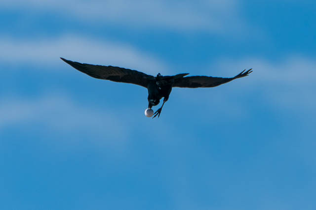 I then walked to Pittwater Road and caught a bus to Collaroy and walked out onto Long Reef. On the way out, I took series of photos of a black bird that flew past. Itseemed to have white front. Looking at the photos later, it was a Raven that had a golf ball in its beak. At one point, it paused in its flight to look at what it had caught, and then resumed its flight. Perhaps that is why they have a term called a “birdie” in golf?