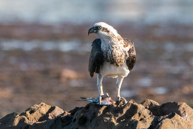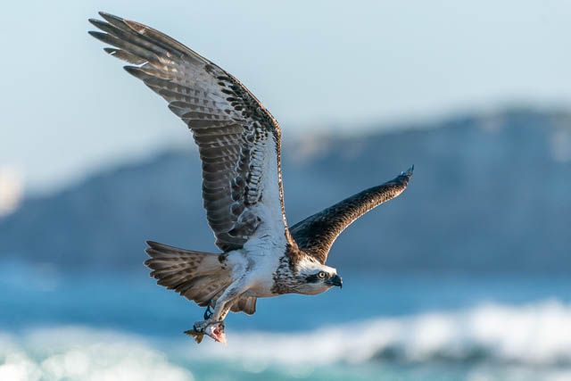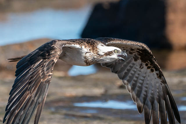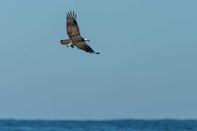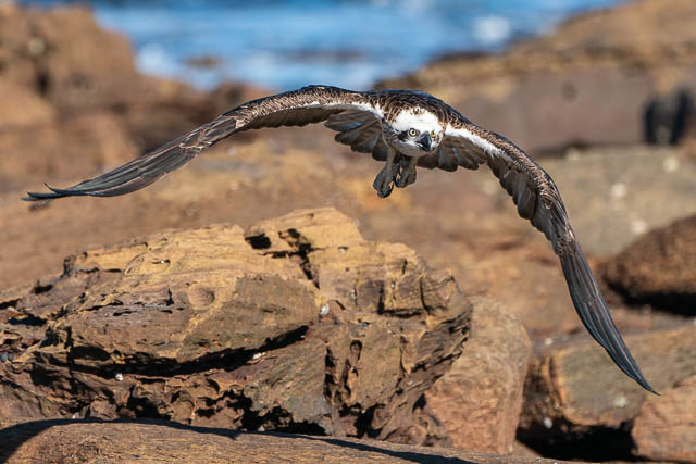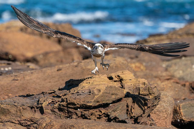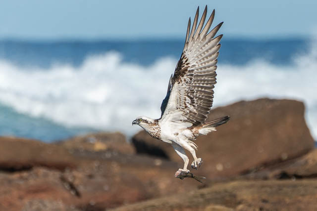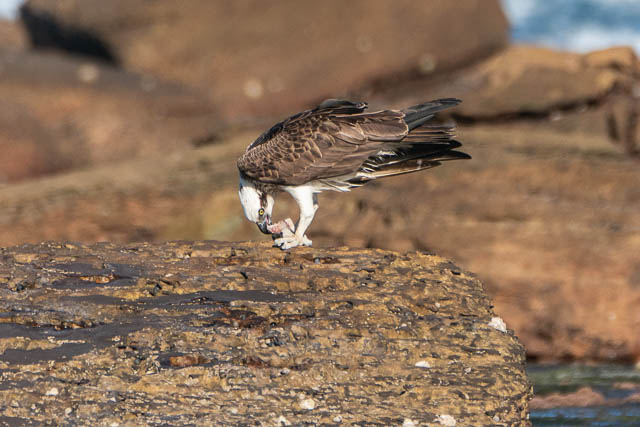 I then was about to walk down towards Dee Why on the path, but looking down I saw an Osprey again perched on a rock on the platform below. So I headed down. This Osprey was eating a fish it had caught. I was able to get several sequences of it taking off and in flight –