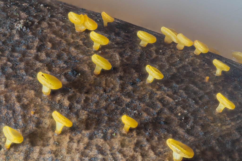 Above - Tiny fungi growing on a leaf. Perhaps Bisporella sp.