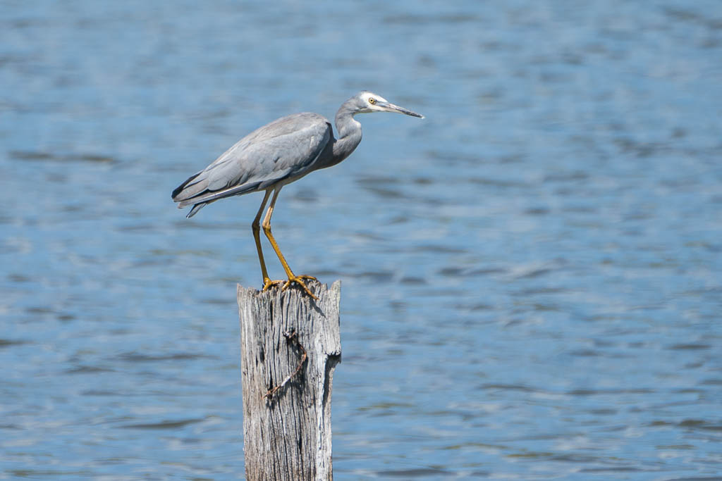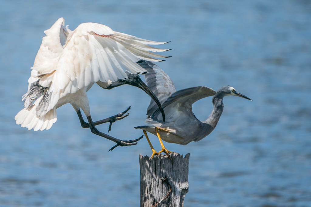 Above - A White Faced Heron lands on a post in the lagoon