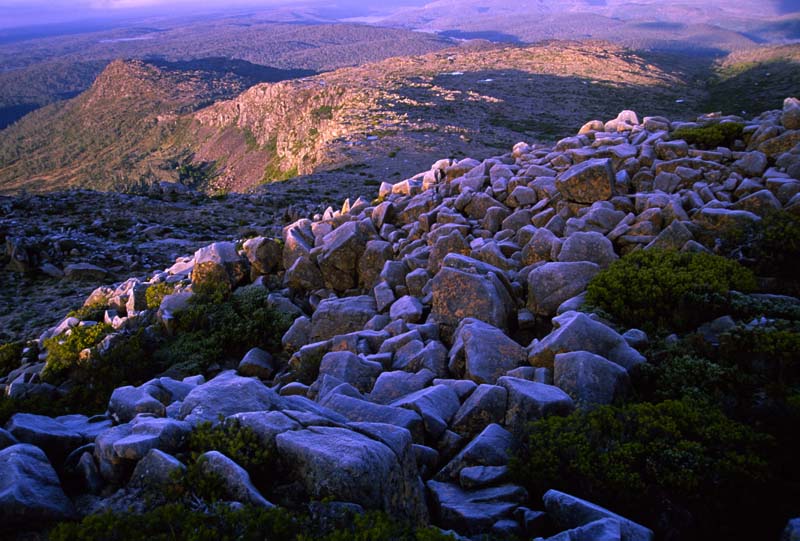 The country in this section of Tasmania is incredibly beautiful - with many small lakes and tarns often fringed by stands of Pencil Pines. Early on the walk I came accross a flock of about 30 Bennett Wallabies near lake Lucy Long. All the way to the Walls - it was uncommon not to come accross a few of these wallabies every ten minutes or so. Each time I have traversed this section of Tasmania I end up going a slightly different route (there is no track - but the country is open and easy to walk) - and I am always staggered with the wild beauty. I stayed at the Walls of Jerusalem for one night. When I arrived - there was light rain - but the next morning I got up early and was rewarded with a fine sunrise from the top of the West Wall. All the dolerite boulders were frosted and all pools were frozen over.