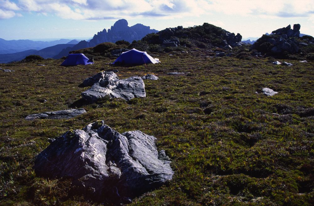 Above - camp at the top of the buttongrass on Lancasters Lead