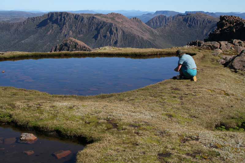 Above - Lisa gets some water on the summit plateau of Mt Ossa. Mt
