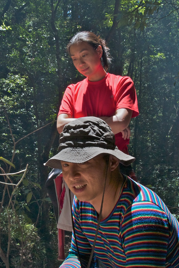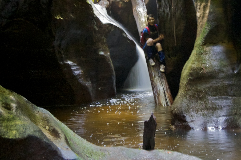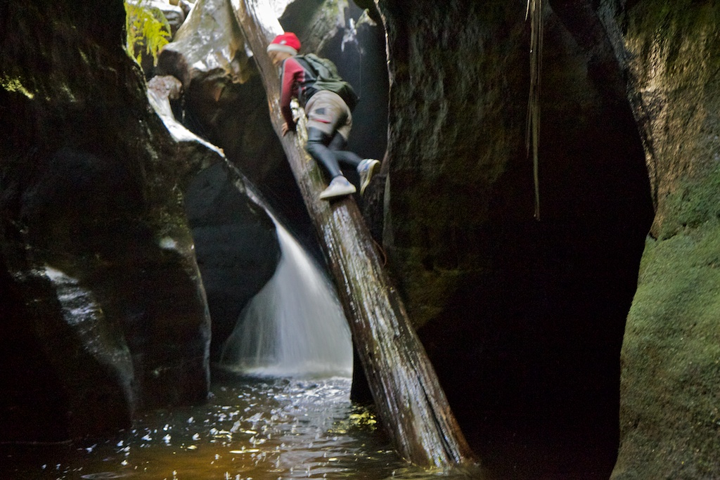 Above - Wendy climbing down a log - a handy way down this small drop.
