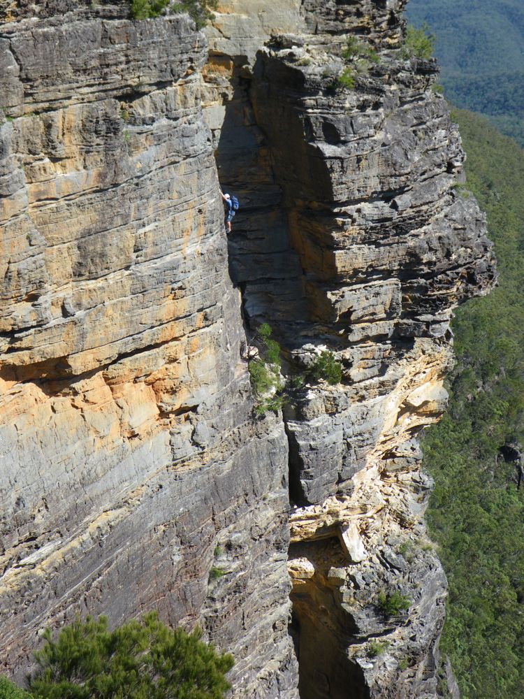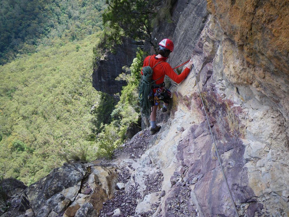 Above - Sarah on the "terror traverse" on the approach to the climb