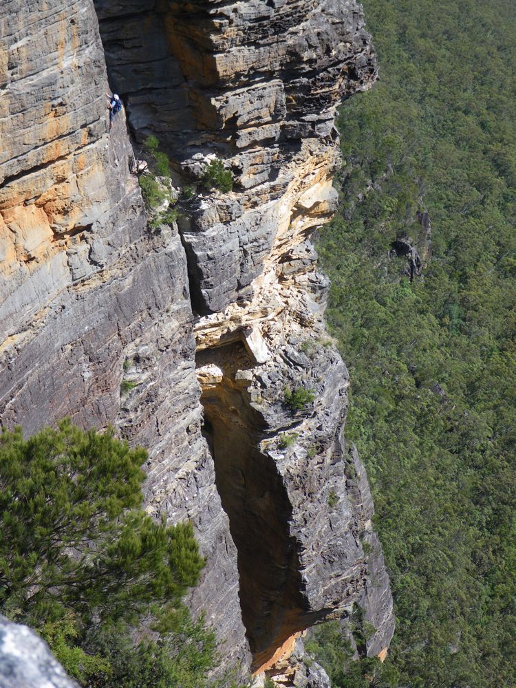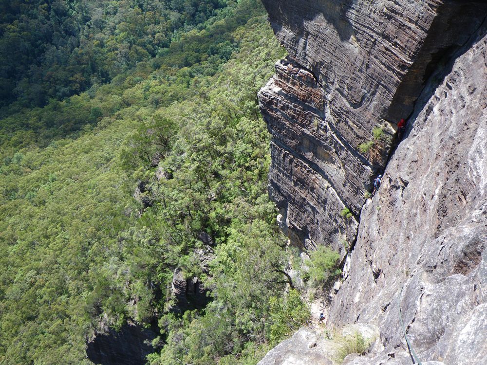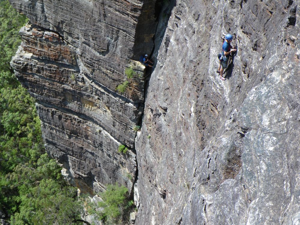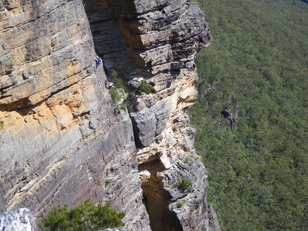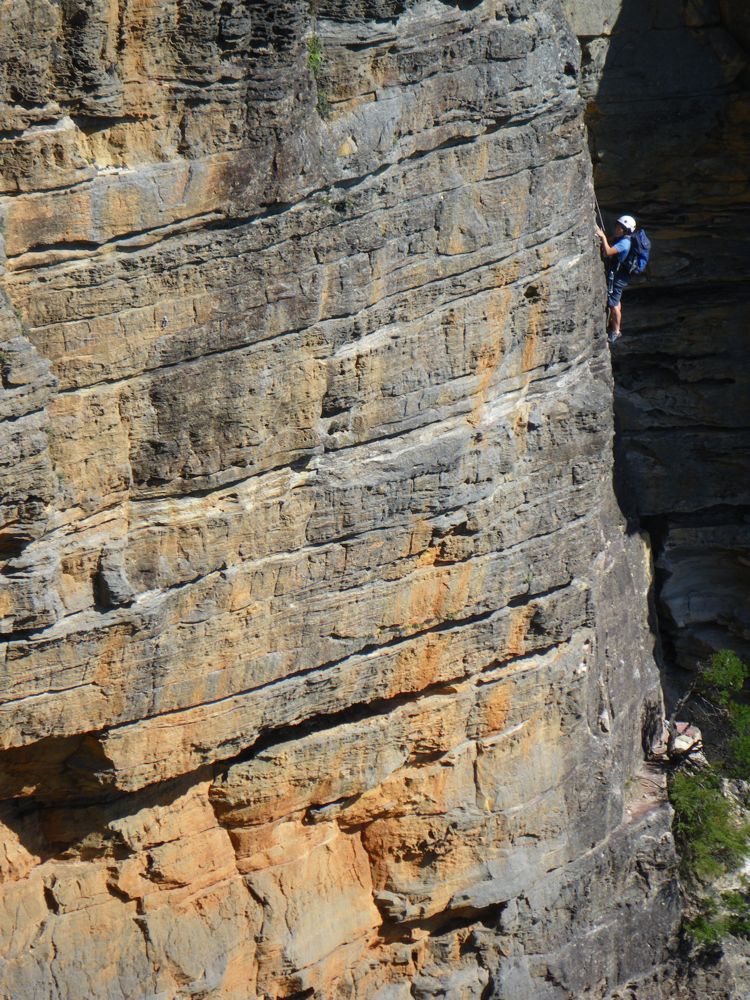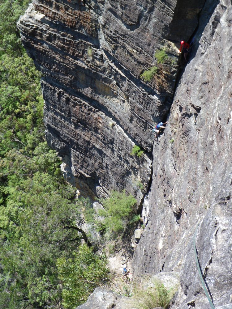Above - Albert (blue helmet) on the second pitch. Sarah above belaying me across the third pitch. Kim below